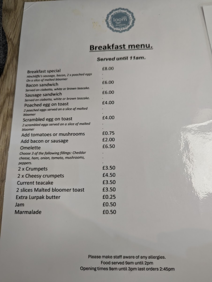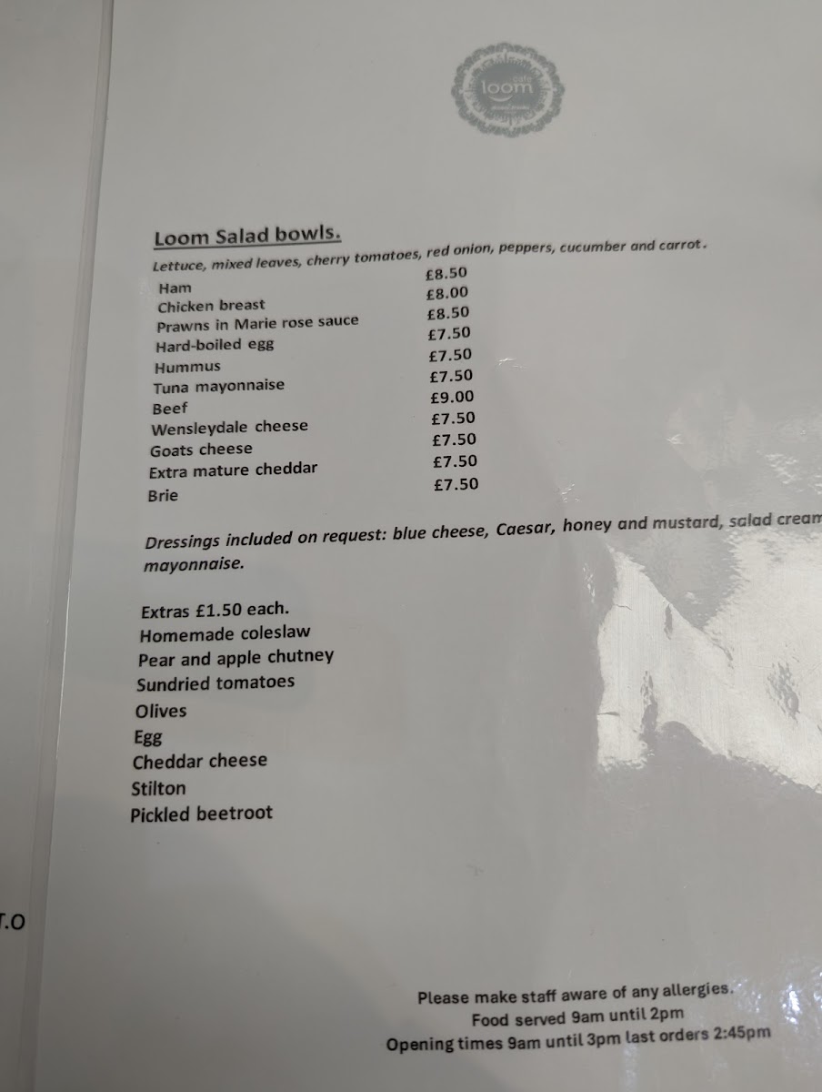 Welcome to Cafe Loom, a delightful cafe nestled in Honley, Huddersfield. Known for its friendly ambience and exceptional menu, this spot is a must-visit for food lovers. The menu features a range of enticing options, including salad sandwiches like Tuna and Hummus, priced between £6.50 and £8.00, perfect for a light lunch. For those craving something more filling, their hot sandwiches like Bacon, Brie, and Cranberry (£8.50) and Chicken with Pesto (£8.50) will not disappoint.